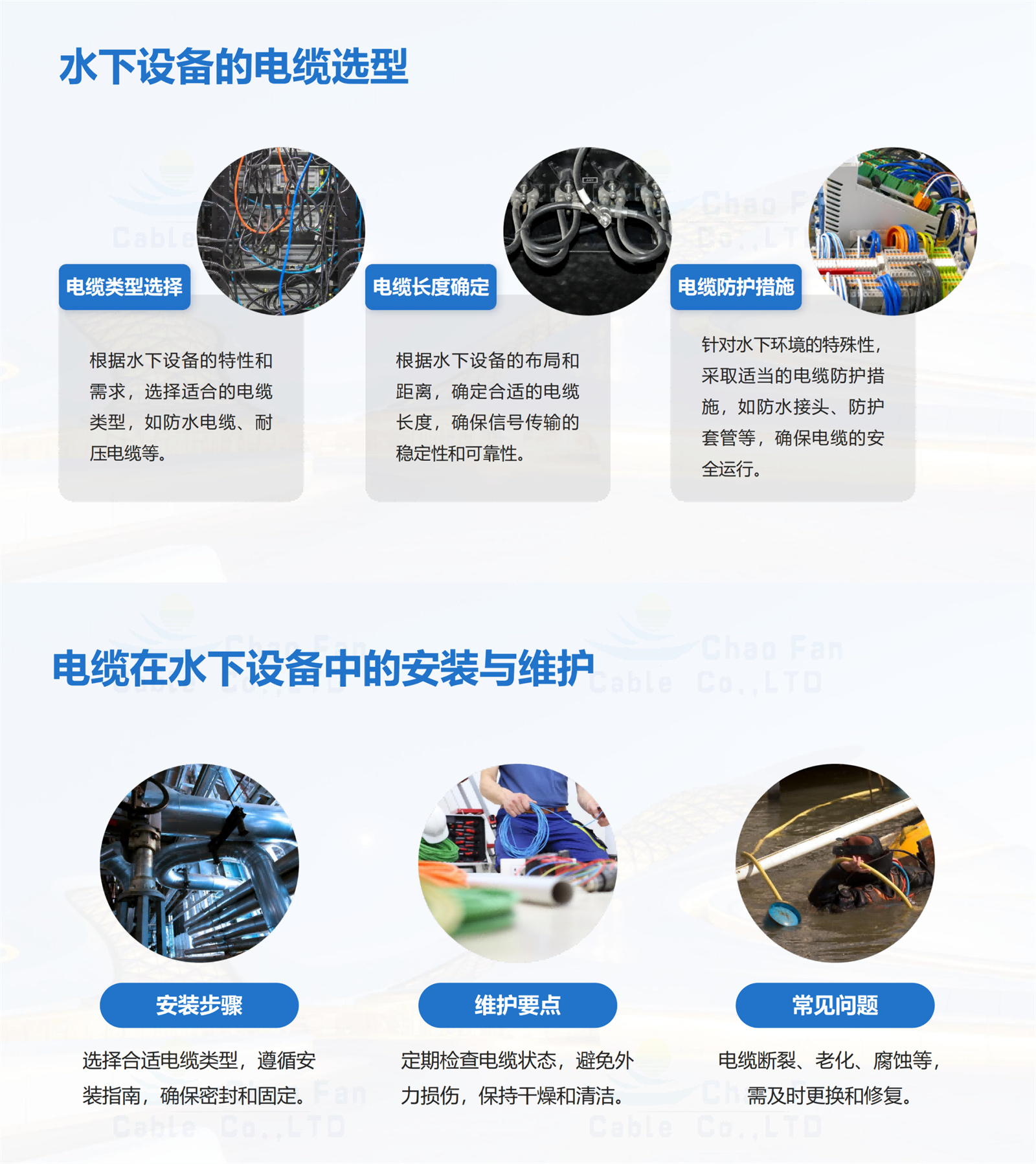 应用于淡水环境或海水环境中的水下机器人设备。广泛应用于海洋探测机器人、水下ROV无人机遥控潜水器、水下摄像机、水下施工、水下搜救机器人、管道探测机器人、潜水泵以及各种水下电气设备与岸基设备之间的连接。