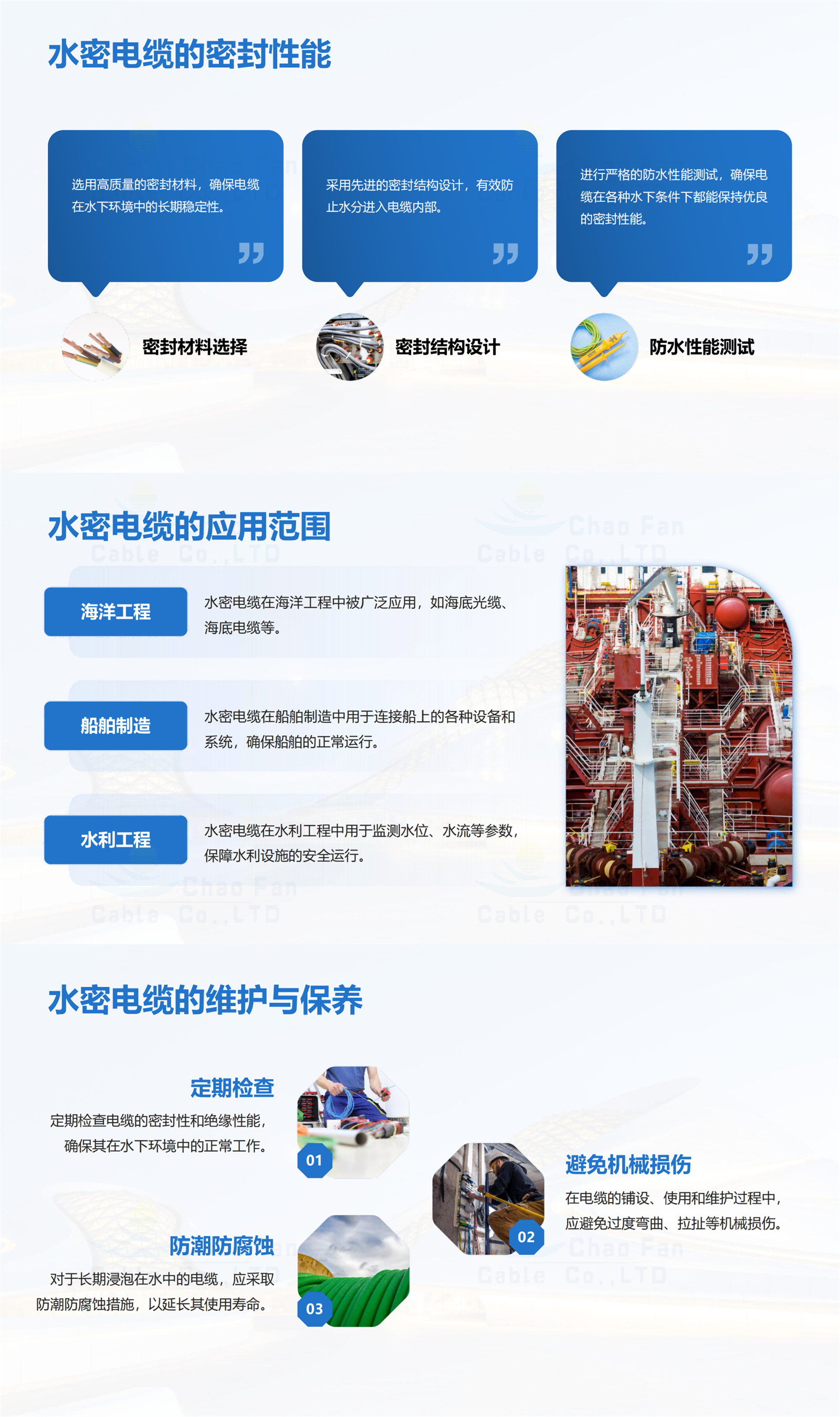 水密电缆是利用阻水胶或发泡阻水带,在护套破损的情况下,延缓水在电缆内部流动的速度,提高设备使用的可靠性。水密电缆是一种能在深水中使用的,具有纵向水密特性,海水不易渗透到内部的深水电缆。