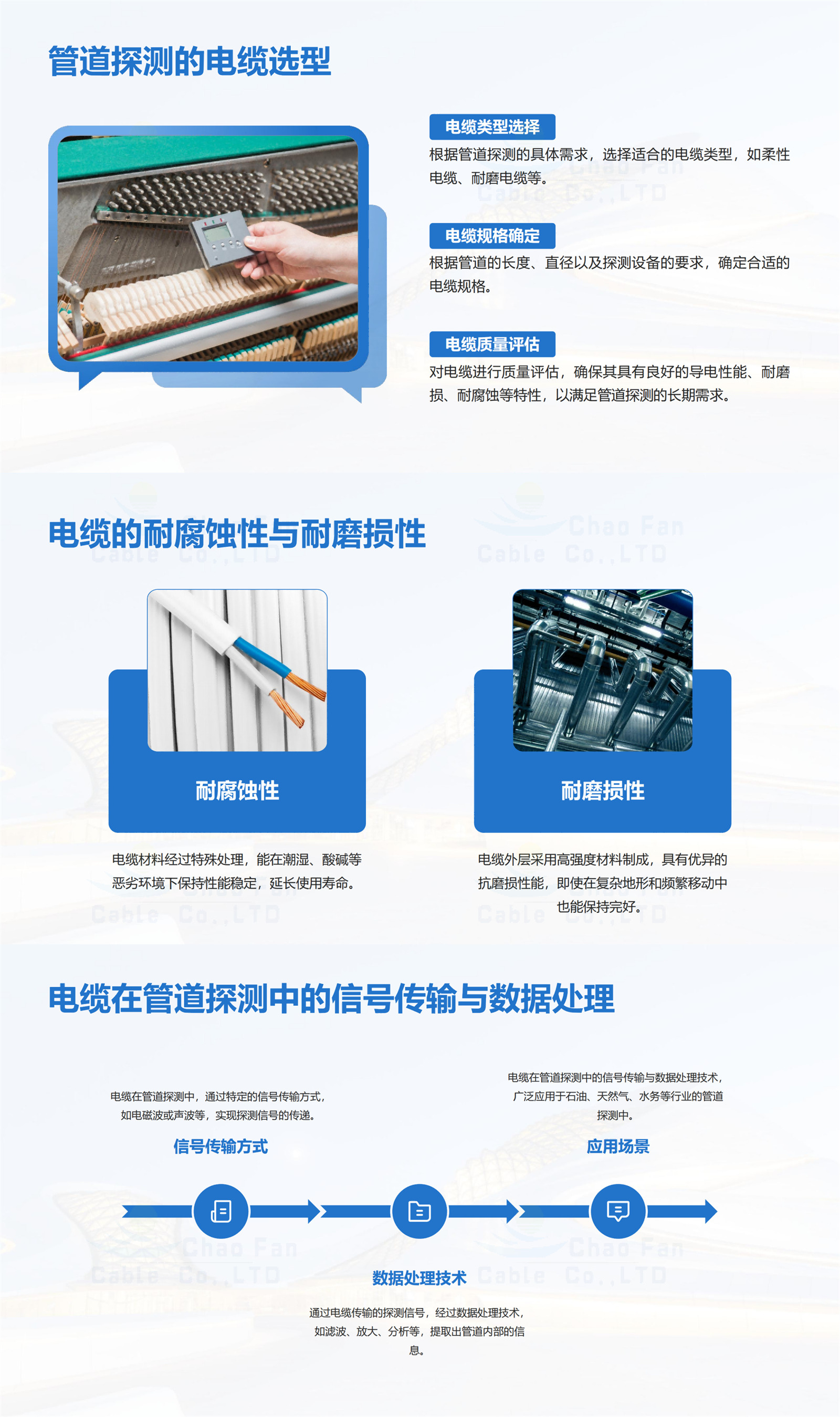 适用于工业内窥镜以及管道内窥镜中,主要用于传输摄像头的视频信号和控制器产生的控制信号。由于线缆自身长度较大,需要收纳在线盘中。在石油和天然气工业中,管道内窥镜可以用于检查天然气和石油管道内部的腐蚀、裂纹和其他缺陷,以确保管道的安全运行。市政供水系统:在市政供水系统中,管道内窥镜可以用于检查供水管道内部的污染、锈蚀和其他缺陷,以确保饮用水的安全。